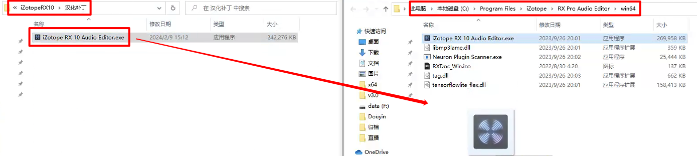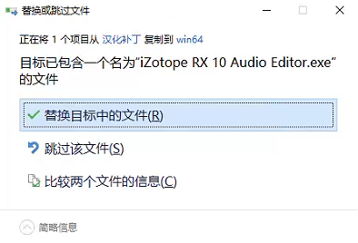 在安装包路径\iZotopeRX10\汉化补丁找到iZotope RX 10 Audio Editor.exe,拖拽到iZotope的安装位置,如下