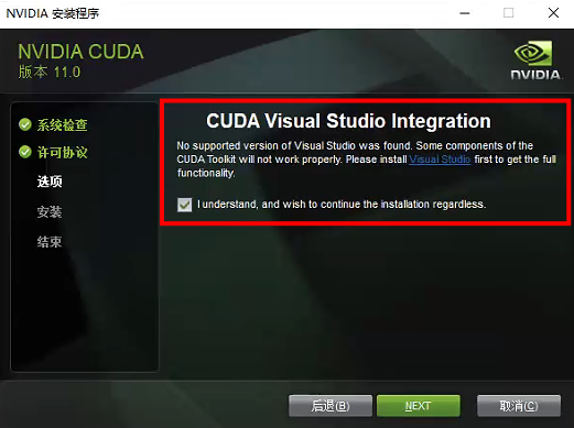 这一步要求先安装Visual Studio才能正常配置CUDA toolkit, 打上对勾,点Next即可,因为我们不做CUDA开发
