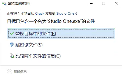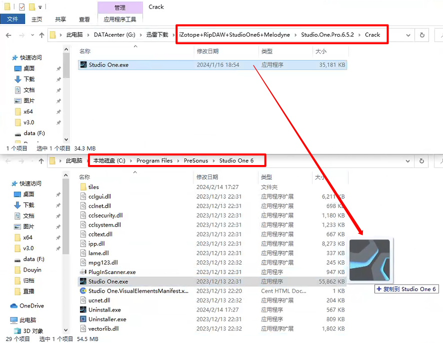 在安装包路径\Studio.One.Pro.6.5.2\Crack找到Studio One.exe,拖拽到Studio One 6的安装位置,如下