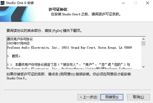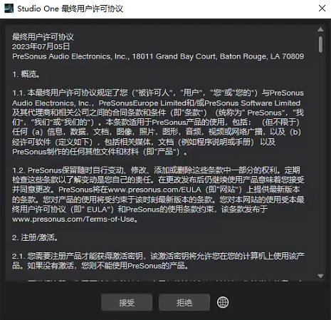 双击运行桌面上的Studio One 6,出现如下界面,点击接受
